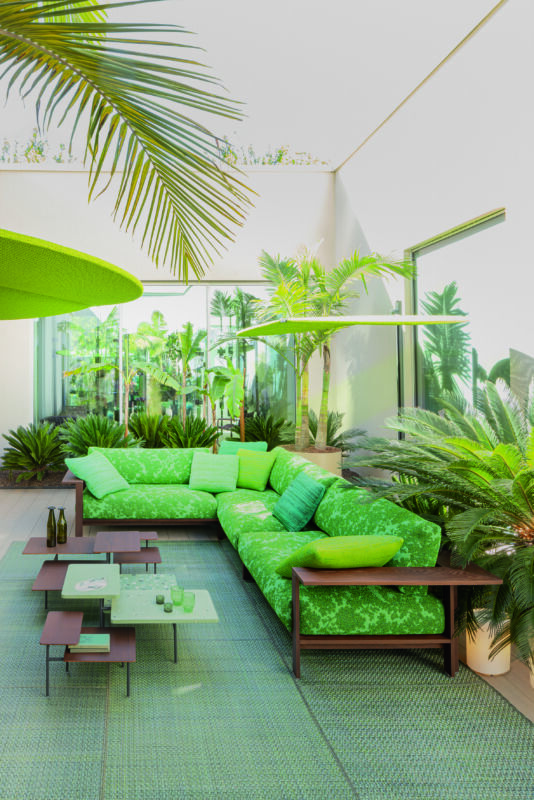 All’interno dello showroom, gli arredi per esterni sono affiancati alle nuove collezioni per l’indoor. “Partendo dall’osservazione che la casa riflette le stratificazioni della vita, accogliendo gli oggetti che fanno parte del nostro passato, abbiamo sviluppato una linea di elementi per l’indoor che si compone di pezzi molto personalizzabili da mischiare fra loro, proprio come si fa nella propria casa”, conclude Paola Lenti. E com’è casa sua? “Stupirà, ma è poco colorata. Quando rientro a casa ho bisogno di staccare, anche dalle sollecitazioni cromatiche. Riposo lo sguardo, anche indossando tonalità neutre. Poi riverso tutto nel lavoro. È il mio modo di trovare l’equilibrio”.