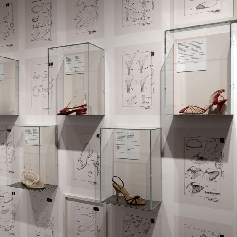 Una delle sezioni più affascinanti è dedicata ai brevetti. Nel corso della sua vita Ferragamo ne depositò ben 369, dimostrando una mentalità progettuale molto vicina a quella del design contemporaneo. Tra le invenzioni più celebri spicca il tacco a zeppa in sughero, brevettato nel 1937. L’idea nacque da una necessità pratica: durante le sanzioni economiche imposte all’Italia dopo la guerra d’Etiopia risultava difficile reperire l’acciaio tedesco utilizzato per i cambrioni metallici delle scarpe. Ferragamo trasformò la difficoltà in innovazione, creando una soluzione che garantiva stabilità all’arco plantare e apriva nuove possibilità estetiche. Anche in questa capacità di trasformare il vincolo in opportunità si riconosce la sua grandezza.