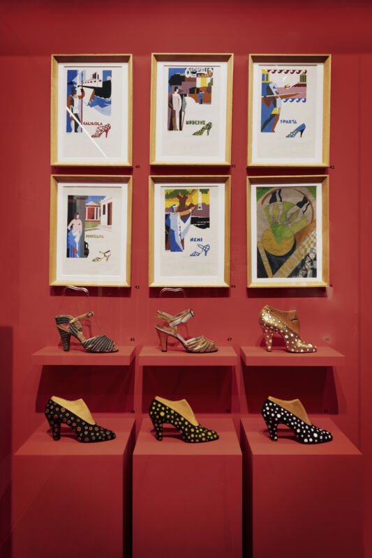 Le calzature realizzate da Salvatore Ferragamo sono veri e propri manufatti artistici e l’esposizione le presenta non soltanto per il loro valore estetico, ma anche in relazione al contesto culturale, storico e creativo in cui sono state ideate. Materiali inediti, lavorazioni sperimentali, accostamenti cromatici audaci: blu intensi, verdi smeraldo, gialli luminosi, oro e argento. Il colore, soprattutto il rosso – simbolo di vita ed energia – diventa per Ferragamo un linguaggio espressivo capace di rompere con la tradizione e dialogare con l’avanguardia artistica del Novecento. Non a caso tra le collaborazioni più significative emerge quella con il pittore futurista Lucio Venna, autore dell’identità visiva del marchio.
